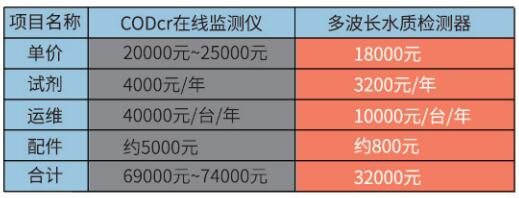 資金投入少:農村生活污水一般需要監測的污染因子有:COD、氨氮、pH、總磷、BOD等。以監測COD因子的投入舉例(見下表)。