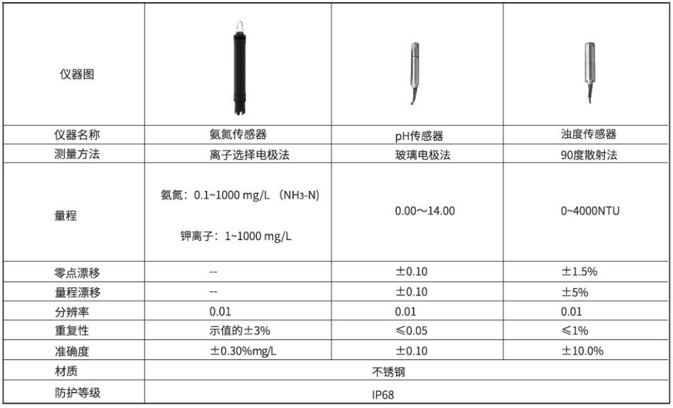 單元組成:多波長水質檢測器、氨氮傳感器、pH傳感器、濁度傳感器以及現場數據顯示表頭。