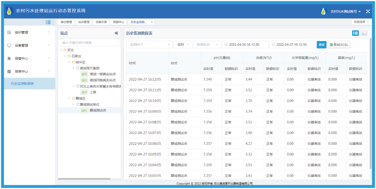 河北德潤厚天儀器制造有限公司一直致力于環保監測設備研發制造,公司研發團隊負責人曾多次深入農村生活污水處理站實地考察,結合現場實際情況,經過大量實驗及實地測試,開發出農村污水處理站運行動態管控系統。